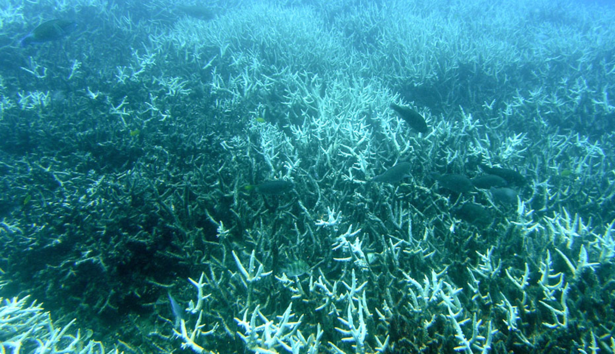 Bleached branching coral (Acropora sp.) at Heron Island, Great Barrier Reef.